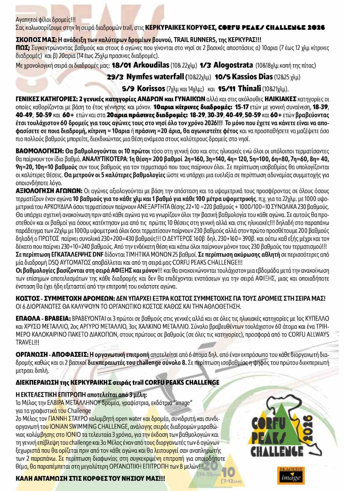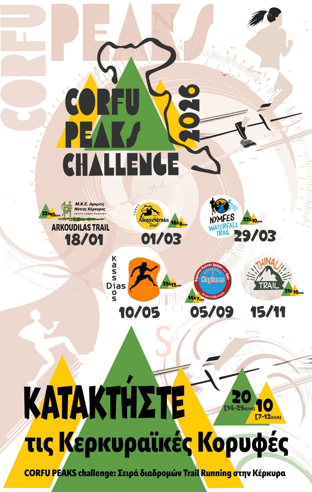 Το Corfu Peaks Challenge 2026 περιλαμβάνει 6 αγώνες που διεξάγονται μέσα στη χρονιά στην Κέρκυρα, σε δύο βασικές κατηγορίες αποστάσεων:
